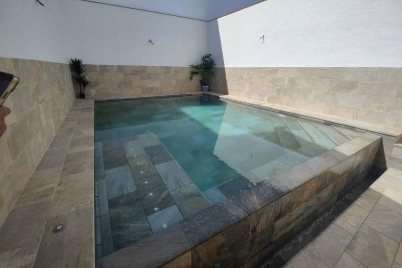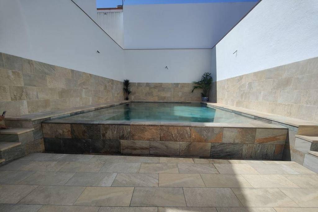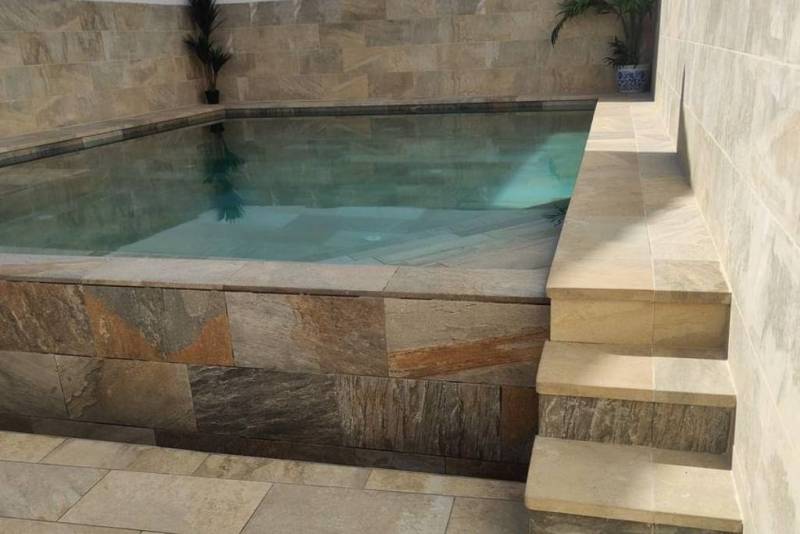 La plage de la piscine et l'habillage extérieur (y compris les marches) sont réalisés en Pietro Golden. Ce matériau imite à la perfection la pierre dorée méditerranéenne tout en offrant les avantages techniques du grès cérame :