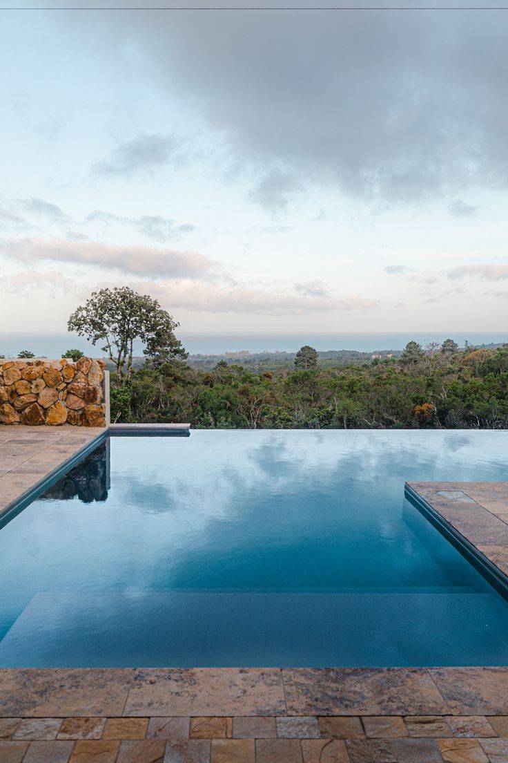 La piscine à débordement crée une ligne d’eau parfaitement horizontale qui se confond avec l’horizon. Associée à un revêtement gris, elle renforce :